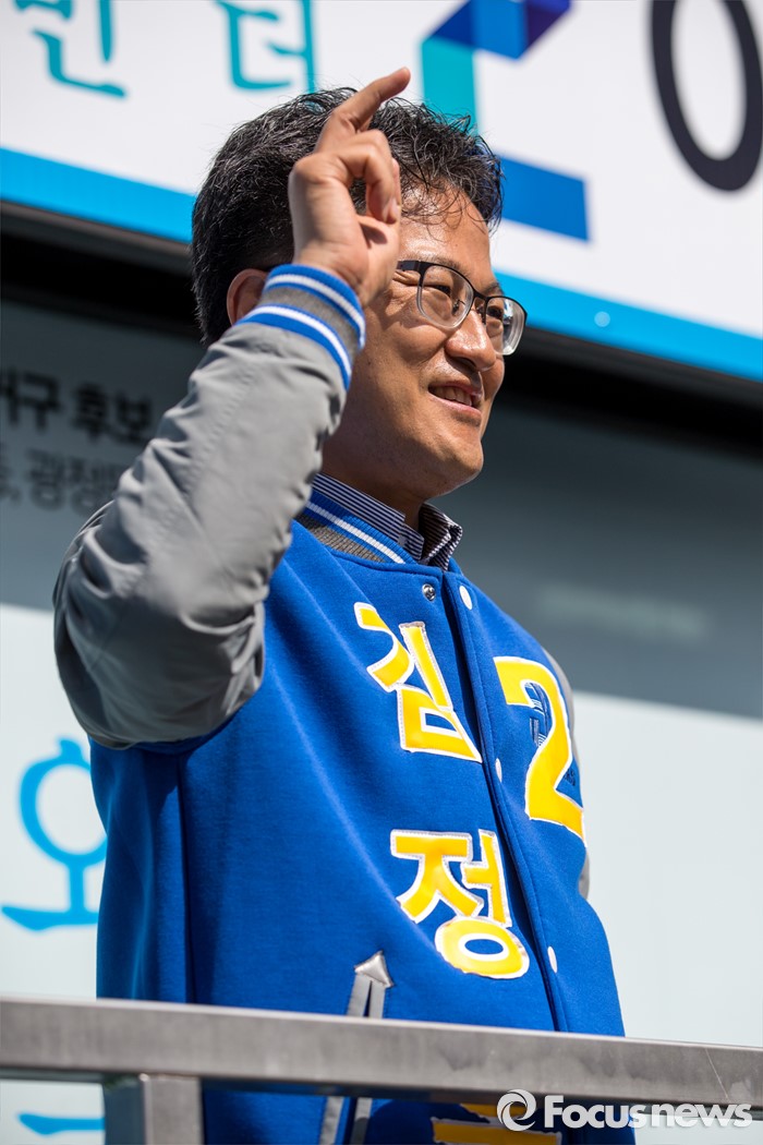 (군포=포커스뉴스) 김정우 더불어민주당 군포시갑 후보가 7일 오전 경기도 군포시 산본중심상가에서 유권자들에게 한 표를 호소하고 있다.