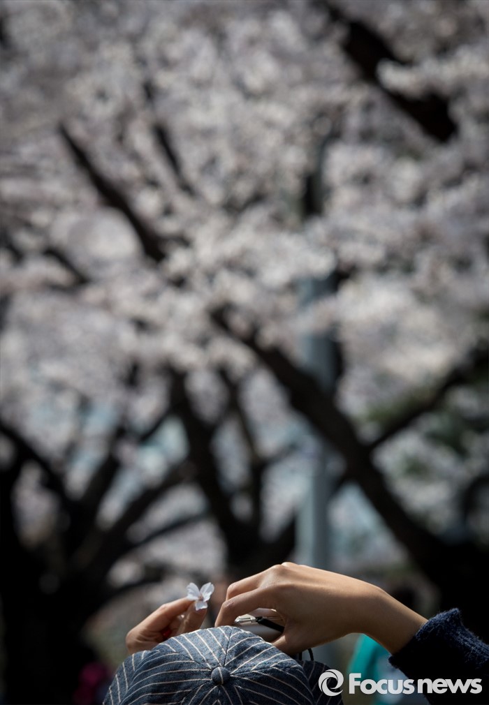 (서울=포커스뉴스) 7일 오전 서울 여의도 윤중로 일대에서 열린 벚꽃축제를 찾은 상춘객이 사진을 찍고 있다.