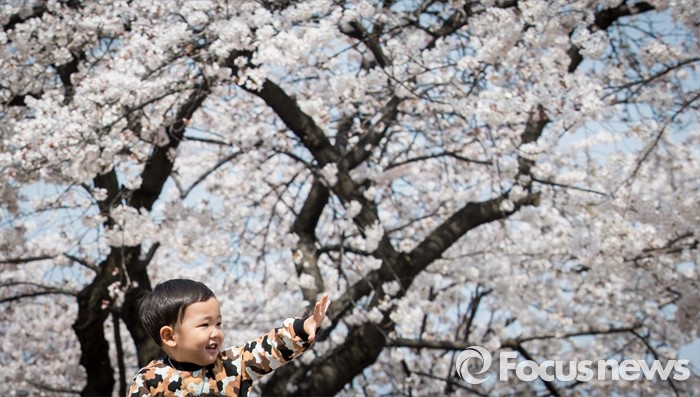 (서울=포커스뉴스) 7일 오전 서울 여의도 윤중로 일대에서 열린 벚꽃축제를 찾은 어린이가 아빠 어깨 위에서 활짝 웃고 있다.