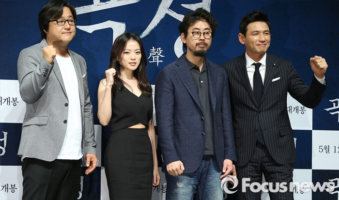 (서울=포커스뉴스) 7일 오전 서울 강남구 압구정 CGV에서 열린 영화 '곡성' 제작보고회에 참석한 배우 곽도원(왼쪽부터), 천우희, 나홍진(감독), 황정민이 포토타임을 갖고 있다.