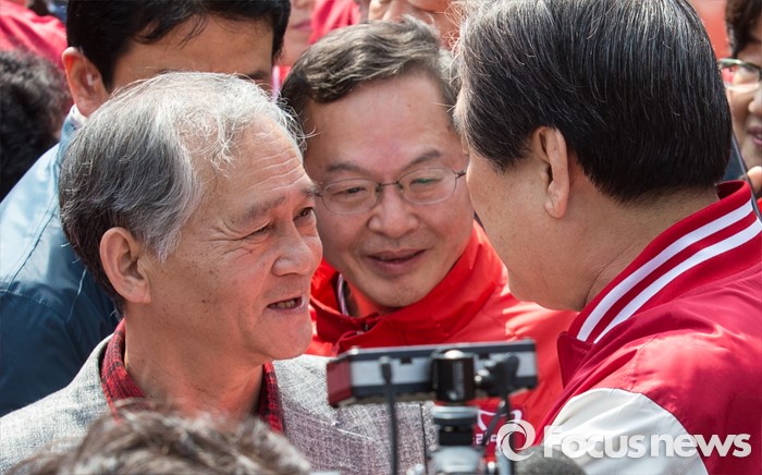 (서울=포커스뉴스) 7일 오후 서울 마포구 늘장공원에서 열린 안대희 새누리당 마포갑 후보 집중유세에 참석한 김무성 대표가 한 시민과 악수하고 있다.