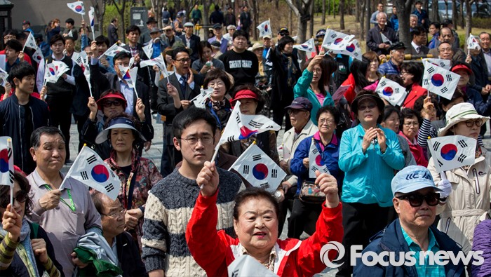 (서울=포커스뉴스) 7일 오후 서울 마포구 늘장공원에서 열린 안대희 새누리당 마포갑 후보 집중유세장에 모인 시민들이 태극기를 흔들며 지지를 보내고 있다.