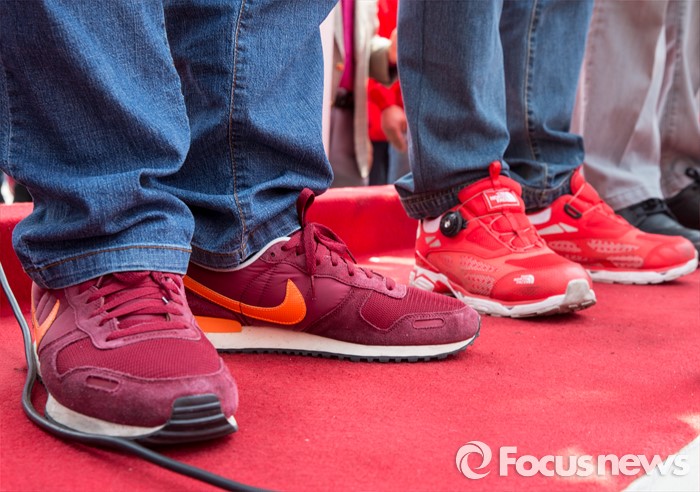 (서울=포커스뉴스) 7일 오후 서울 마포구 늘장공원에서 열린 안대희 새누리당 마포갑 후보 집중유세에 참석한 김무성(왼쪽) 대표와 안 후보의 운동화.