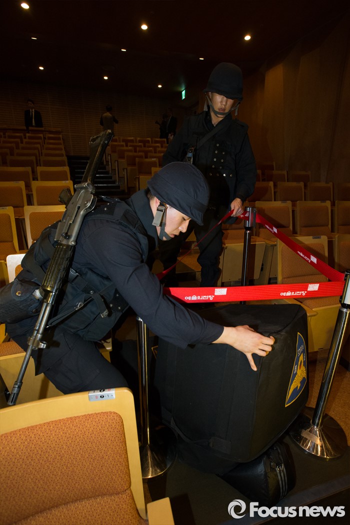 (서울=포커스뉴스) 7일 오후 서울 서초구 예술의전당 음악당에서 열린 유관 기관 합동 대테러훈련에서 경찰들이 폭발 의심물을 처리하고 있다. 이번 훈련은 공연 도중 폭발 의심물체가 발견된 상황을 설정해 훈련을 진행했다.