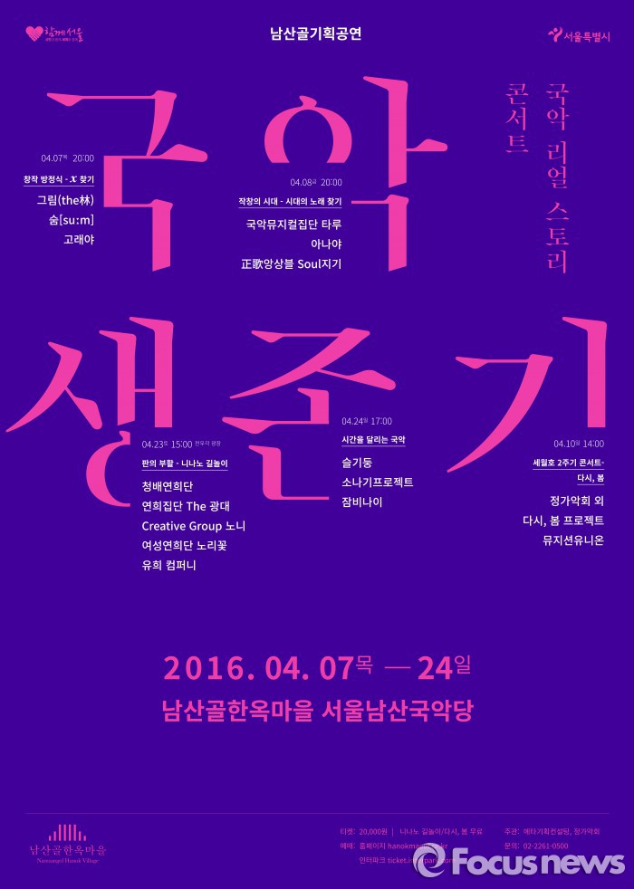 공연을 기획한 권보라 남산골한옥마을 PD는 "긴시간 동안 현대사회에서 국악으로 살아남기 위해 노력했던 단체들의 진정성과 음악이 관객들에게 전해지길 바란다"며 "이번 공연이 예술가가 스스로 생존할 뿐 아니라 사회와 함께 살아가는 방법에 대해 모색하고 격려하는 자리가 될 것"이라고 말했다.<사진제공=서울시청>