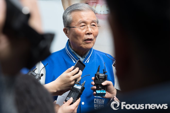 (원주=포커스뉴스) 김종인 더불어민주당 비대위 대표가 7일 오후 강원도 원주중앙시장 인근에서 송기헌 더불어민주당 원주을 후보, 권성중 더불어민주당 원주갑 후보와 유세를 마치고 취재진의 질문에 답변을 하고 있다.