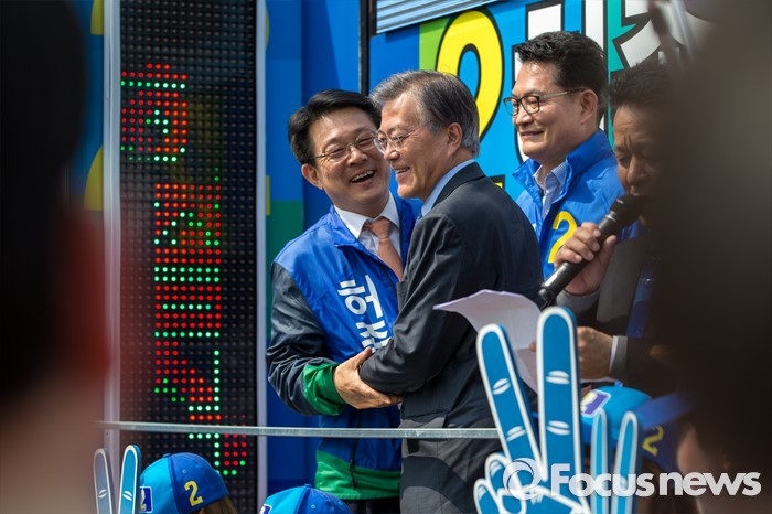 (인천=포커스뉴스) 문재인 더불어민주당 전 대표가 7일 오후 인천광역시 지하철1호선 주안역 남광장에서 열린 인천 지역 후보 합동유세에 앞서 허종식 인천광역시 계양구을 후보와 포옹 하고 있다.