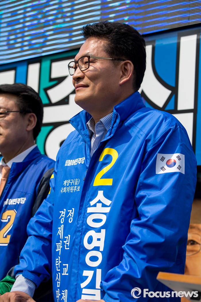 (인천=포커스뉴스) 송영길 더불어민주당 인천광역시 계양구을 후보가 7일 오후 인천광역시 지하철1호선 주안역 남광장에서 열린 인천 지역 합동유세에 참석 하고 있다.