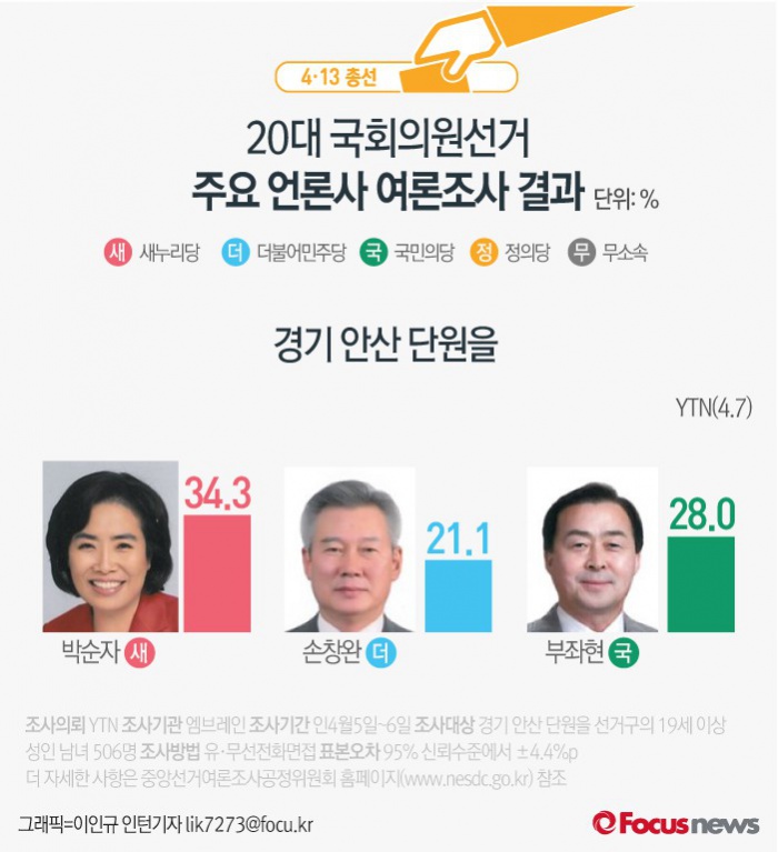 (서울=포커스뉴스) YTN이 여론조사기관 엠브레인에 의뢰해 7일 발표한 결과에 따르면 경기 안산 단원을의 지지율은 새누리당 박순자 후보(34.3%), 더불어민주당 손창완 후보(21.1%), 국민의당 부좌현 후보(28.0%)순인 것으로 나타났다.