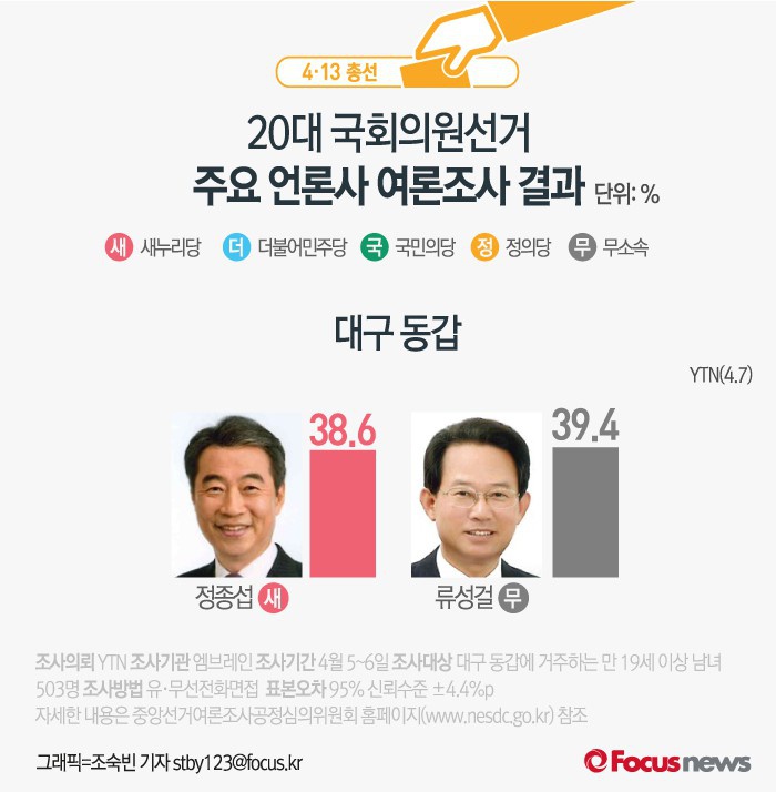 (서울=포커스뉴스) YTN이 여론조사기관 엠브레인에 의뢰해 7일 발표한 결과에 따르면 대구 동갑에서 새누리당 정종섭 후보의 지지율은 38.6%, 무소속 류성걸 후보의 지지율은 39.4%인 것으로 나타났다.
