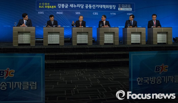 (서울=포커스뉴스) 7일 오후 서울 종로구 세종문화회관에서 열린 한국방송기자클럽 초청토론회에 참석한 강봉균(왼쪽 세번째) 새누리당 공동선거대책위원장이 패널들과 토론을 하고 있다.