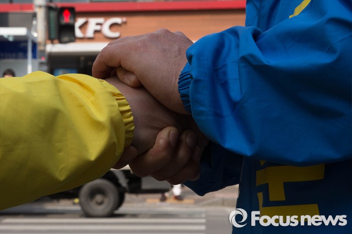 (서울=포커스뉴스) 20대 총선을 6일 앞둔 7일 오후 서울 동작구 남성역 골목시장 인근에서 허동준 더불어민주당 동작구을 후보가 김종철 정의당 후보와 단일화에 합의하고 손을 잡고 있다.
