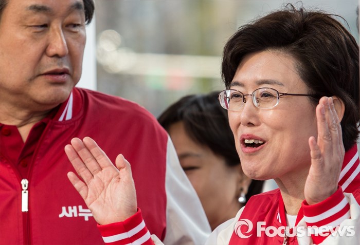 (서울=포커스뉴스) 7일 오후 서울 노원구 롯데백화점 인근에서 이준석 새누리당 노원구병 후보 지원유세에서 최연혜 비례대표 후보가 시민들에게 인사하고 있다.