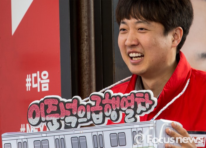 (서울=포커스뉴스) 7일 오후 서울 노원구 롯데백화점 인근에서 이준석 새누리당 노원구병 후보 지원유세에서 이 후보가 밝게 웃고 있다.