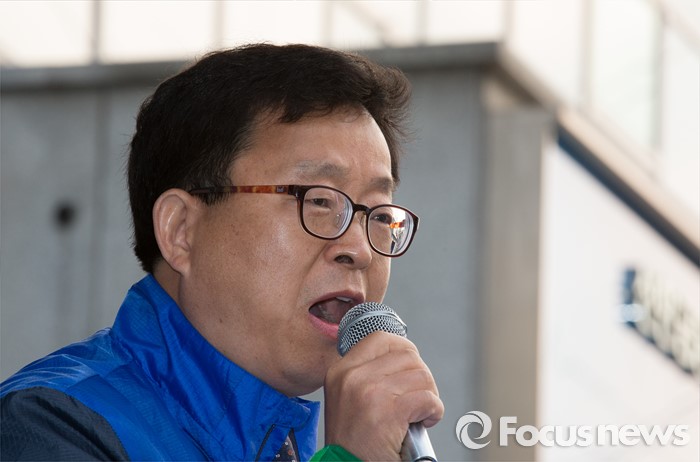 (충주=포커스뉴스) 7일 오후 충북 충주 중앙로에서 김종민 더불어민주당 대표가 지원유세를 나온 가운데 윤홍락 후보가 지지를 호소하고 있다.
