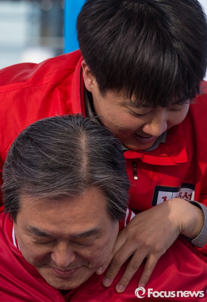 (서울=포커스뉴스) 7일 오후 서울 노원구 롯데백화점 인근에서 이준석 새누리당 노원구병 후보 지원유세에 나선 김무성 대표가 이 후보를 업어주고 있다.