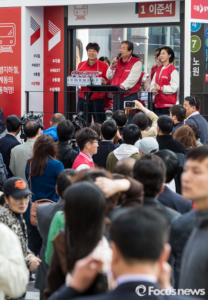(서울=포커스뉴스) 7일 오후 서울 노원구 롯데백화점 인근에서 이준석 새누리당 노원구병 후보 지원유세에 나선 김무성 대표가 유권자들의 지지를 호소하고 있다.