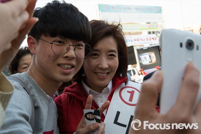 (서울=포커스뉴스) 20대 총선을 6일 앞둔 7일 오후 서울 동작구 흑석빗물펌프장 인근에서 나경원 새누리당 동작구을 후보가 시민들과 사진을 찍고 있다.