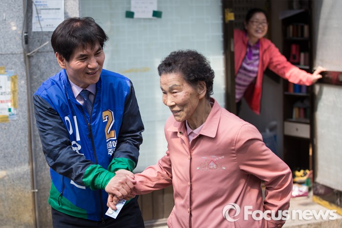(서울=포커스뉴스) 이용선 더불어민주당 양천구을 후보가 7일 오후 서울 양천구 신월동 신월시장에서 선거운동을 하고 있다.