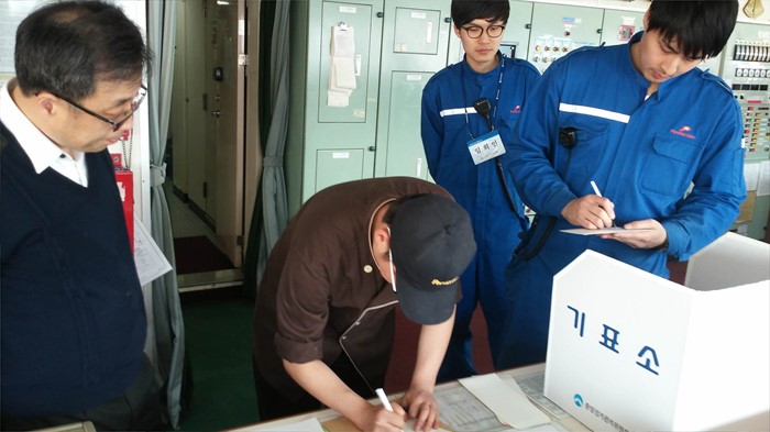 (서울=포커스뉴스) 지난 5일 부산과 일본을 오가는 팬스타 드림호에서 선원들이 선상투표를 하고 있다. <사진제공=부산시 선거관리위원회>
