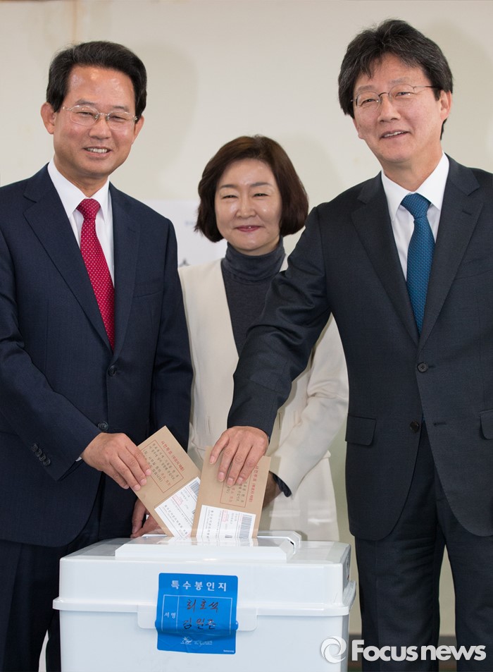 (대구=포커스뉴스) 무소속 유승민(대구 동을, 오른쪽부터), 권은희(대구 북갑), 류성걸(대구 동갑) 후보가 8일 오전 대구 북구 산격3동 주민센터에 마련된 사전투표소에서 사전투표를 하고 있다.