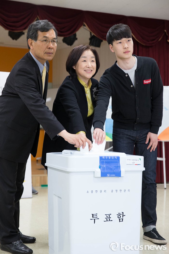 (고양=포커스뉴스) 20대 총선 사전투표가 시작된 8일 오전 심상정(가운데) 정의당 고양갑 후보가 고양시 일산동구 식사동 주민센터에 마련된 사전투표소를 찾아 가족들과 함께 투표하고 있다. 왼쪽은 남편 이승배 씨, 오른쪽은 아들 우균 씨.
