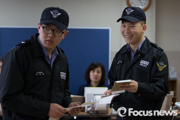 (인천=포커스뉴스) 제20대 국회의원 선거 사전투표 시작일인 8일 오전 인천 연수구 송도1동 주민센터에서 인천 중부해양경비안전본부 소속 해경들이 사전투표 순서를 기다리고 있다.