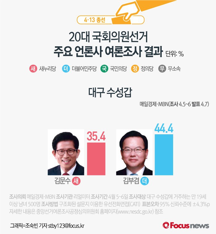 (서울=포커스뉴스) 매일경제와 MBN이 여론조사기관 리얼미터에 의뢰해 7일 발표한 결과에 따르면 대구 수성갑에서 새누리당 김문수 후보의 지지율은 35.4%, 더불어민주당 김부겸 후보의 지지율은 44.4%인 것으로 나타났다.