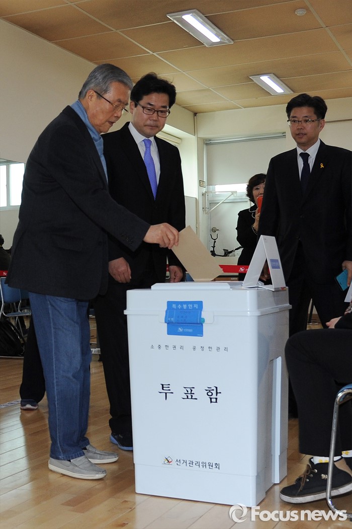(인천=포커스뉴스) 김종인 더불어민주당 비대위 대표 겸 선대위원장이 8일 오전 인천 연수구 동춘3동주민센터에서 사전투표를 하고 있다.