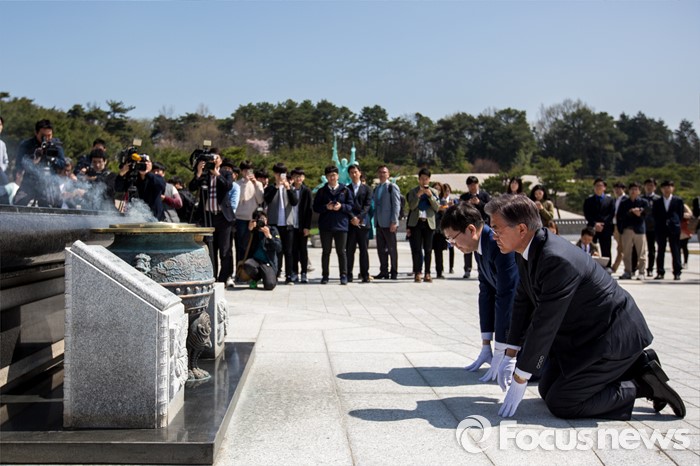 (광주=포커스뉴스) 문재인 더불어민주당 전 대표와 김홍걸 국민통합위원장이 8일 오전 전남 광주 5.18 민주항쟁 추모탑을 찾아 무릎을 꿇고 참배 하고 있다.
