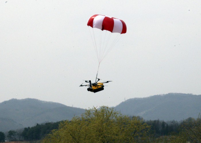 CJ대한통운은 지난 7일 추락감지 기술 및 낙하산 자동 작동장치가 부착된 드론과 화물 자동 하강장치가 장착된 드론을 개발했다고 밝혔다.