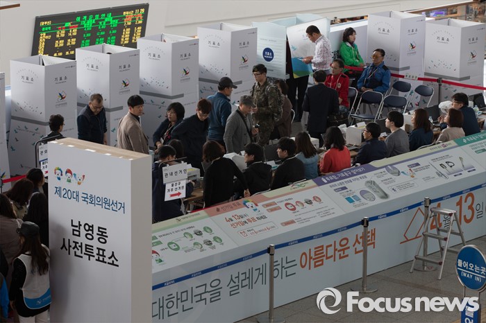 (서울=포커스뉴스) 4.13총선 사전투표 첫째날인 8일 오전 서울 용산구 서울역에 설치된 남영동 사전투표소에서 시민들이 투표를 하고 있다. 사전투표는 4.8~4.9일까지 진행된다.