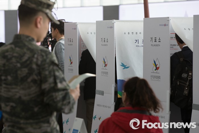 (서울=포커스뉴스) 4.13총선 사전투표 첫째날인 8일 오전 서울 용산구 서울역에 설치된 남영동 사전투표소에서 시민들이 투표를 하고 있다. 사전투표는 4.8~4.9일까지 진행된다.
