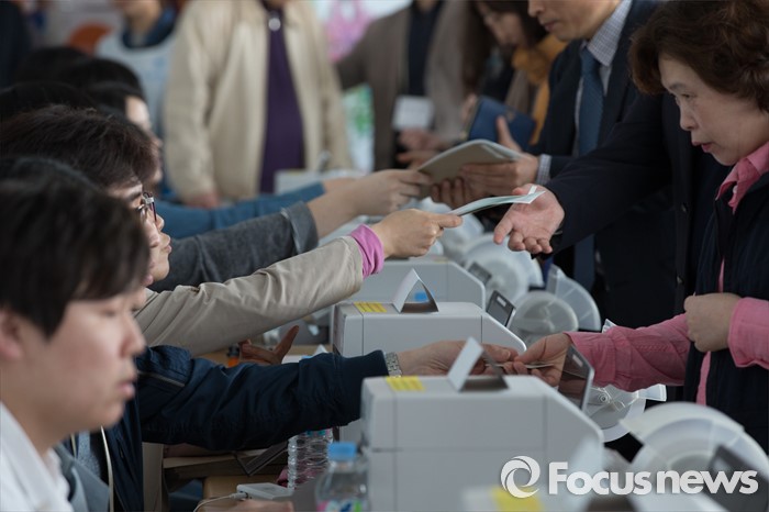 (서울=포커스뉴스) 4.13총선 사전투표 첫째날인 8일 오전 서울 용산구 서울역에 설치된 남영동 사전투표소에서 시민들이 투표를 하고 있다. 사전투표는 4.8~4.9일까지 진행된다.