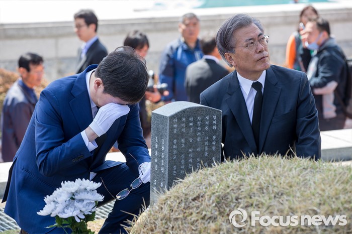 (광주=포커스뉴스) 김홍걸(왼쪽) 국민통합위원장이 8일 오전 전남 광주 5.18 민주묘지를 찾아 참배를 하던 중 눈물을 흘리고 있다. 오른쪽은 문재인 전 더불어민주당 대표.