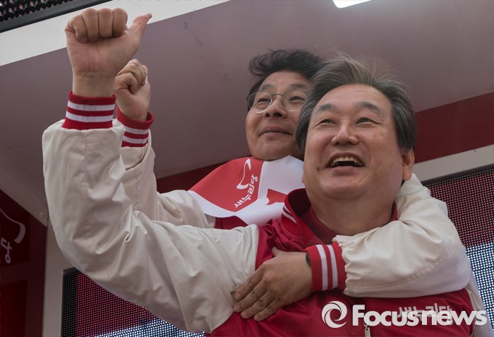 이어 "재정 자급률이 37%에 불과한데 국비와 경기도비를 끌어오지도 못하면서 부천 발전이 정채됐다"며 "부천시민의 명예를 회복하기 위해 부천을 탈환해야 한다"고 강조했다.(부천=포커스뉴스) 8일 오전 경기 부천시 역곡역 인근에서 차명진 새누리당 부천소사구 후보 지원유세에서 나선 김무성 대표가 차 후보를 업어주고 있다. 2016.04.08 양지웅 기자