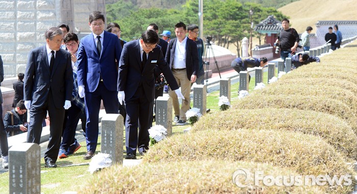 (광주=포커스뉴스) 8일 오른 광주 국립 518묘지를 찾은 더불어민주당 문재인(왼쪽) 전 대표와 김홍걸 국민통합위원장이 묘역을 참배하고 있다.