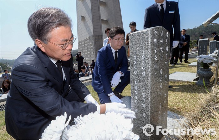 | △ 5.18묘비 살피는 문재인 |