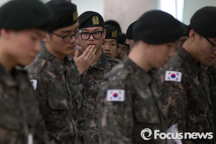 (서울=포커스뉴스) 4.13총선 사전투표 첫째날인 8일 오후 서울 서초구 방배4동 주민센터에 설치된 사전투표소에서 수방사 장병들이 투표를 하기위해 기다리고 있다.