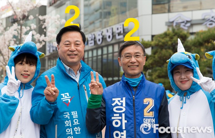 (김포=포커스뉴스) 8일 오후 경기 김포 장기사거리에서 김두관(왼쪽 두번째) 김포시갑 후보와 정하영(오른쪽 두번째) 김포시을 후보가 기념촬영을 하고 있다.