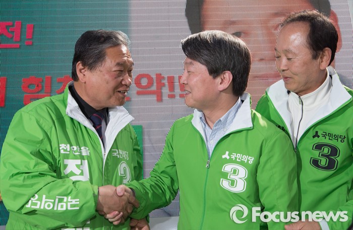 (천안=포커스뉴스) 안철수 국민의당 대표가 8일 오후 충남 천안 신부동 신세계백화점 앞에서 천안에 출마한 후보들과 악수를 하고 있다.