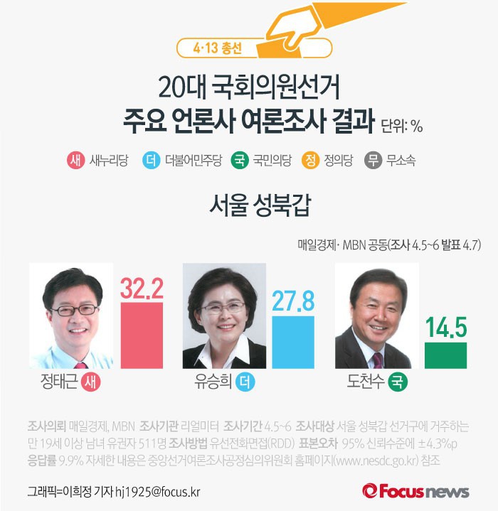 (서울=포커스뉴스) 매일경제와 MBN이 리얼미터에 의뢰해 5~6일 실시한 서울 성북갑 여론조사 결과에 따르면 새누리당 정태근 후보의 지지율은 32.2%, 더불어민주당 유승희 후보의 지지율은 27.8%, 국민의당 도천수 후보는 14.5%로 나타났다.