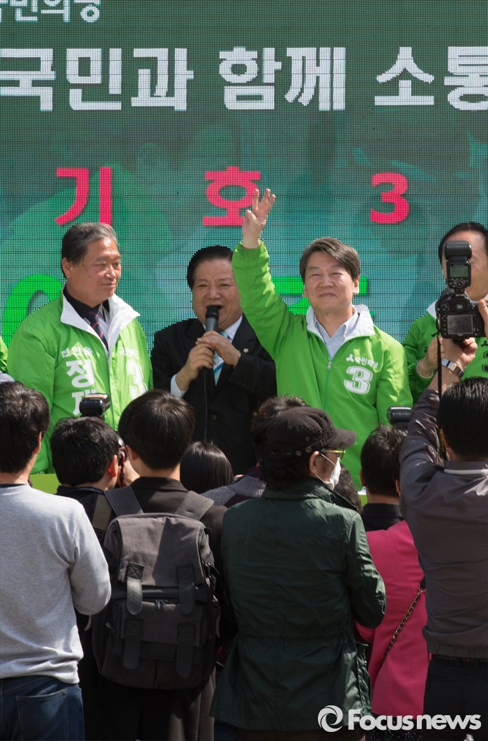 (천안=포커스뉴스) 안철수 국민의당 대표가 8일 오후 충남 천안 신부동 신세계백화점 앞에서 천안에 출마한 후보의 지지를 호소하고 있다.
