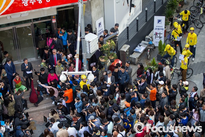(광주=포커스뉴스) 문재인 더불어민주당 전 대표의 기자회견이 진행되고 있는 8일 오후 광주광역시 동구 충장로에서 민주당 선거운동원들이 선거운동을 멈추고 기자회견을 지켜보고 있다.