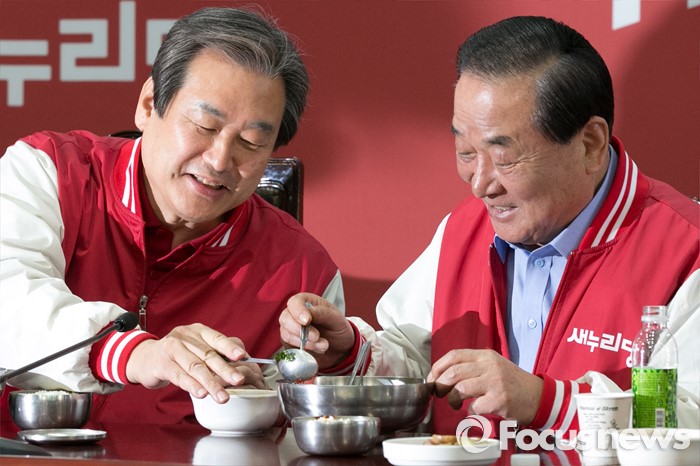 서 최고위원은 "그래서 지금 19대 국회에서 최다선 7선 국회의원하고 있고 8선에 도전하고 있다"며 "대구는 박근혜 대통령을 만드는 전초기지"라고 강조했다.7일 오전 서울 여의도 새누리당사에서 김무성(왼쪽) 대표가 공동선대위원장 긴급회의에 참석해, 서청원 최고위원의 비빔밥에 고추장을 넣어주고 있다. 2016.04.07 박철중 기자