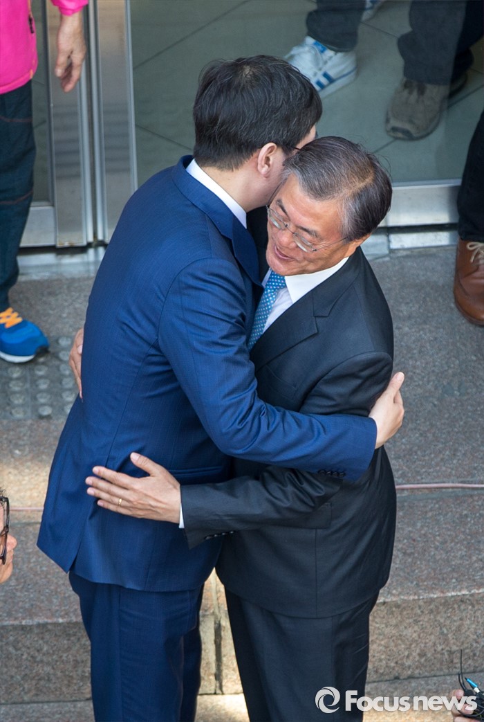 (광주=포커스뉴스) 김홍걸 국민통합위원장이 8일 오후 광주광역시 동구 충장로에서 시민들에게 "문재인 전 대표 아버지(故 김대중 전 대통령) 배신하지않았다"는 입장을 밝힌 뒤 문 전 대표와 포옹 하고 있다.