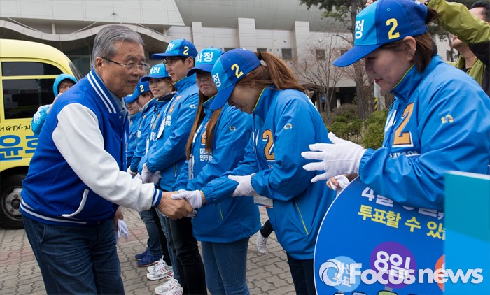 (파주=포커스뉴스) 김종인 더불어민주당 비대위 대표 겸 선대위원장이 8일 오후 경기 파주 금촌역 앞에서 윤후덕 파주시갑 후보와 박정 파주시을 후보 합동지원유세를 마치고 선거운동원들과 인사를 나누고 있다.