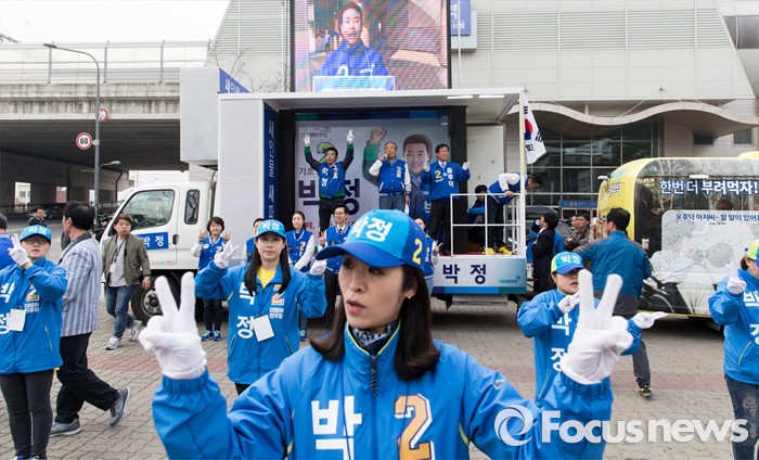 (파주=포커스뉴스) 김종인 더불어민주당 비대위 대표 겸 선대위원장이 8일 오후 경기 파주 금촌역 앞에서 윤후덕 파주시갑 후보와 박정 파주시을 후보 합동지원유세를 하고 있다.