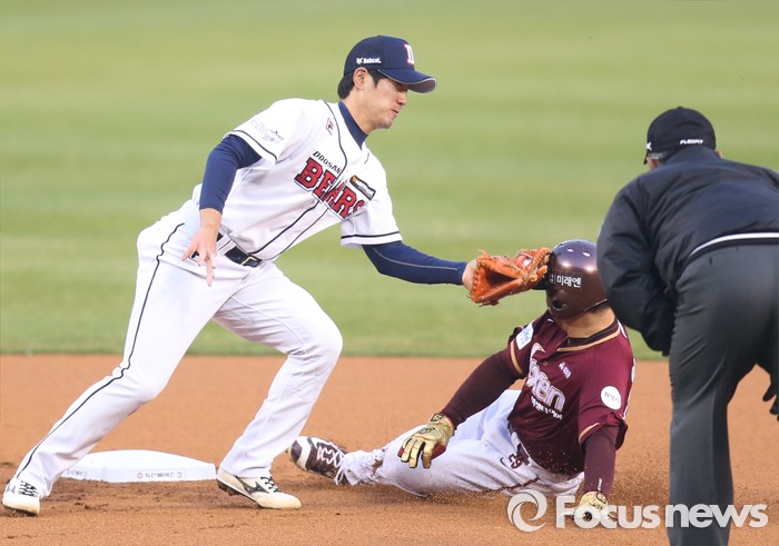 (서울=포커스뉴스) 8일 서울 잠실구장에서 열린 2016 프로야구 넥센-두산 경기 1회초 2사후 중전안타로 진루한 넥센 이택근이 대니 돈 타석때 2루 도루를 시도하다 두산 유격수 김재호에게 태그아웃되고 있다.