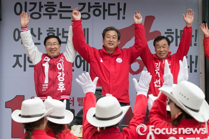 (원주=포커스뉴스) 제20대 국회의원 선거를 나흘 앞둔 9일 오전 강원도 원주시 치악로 남부시장 앞에서 김무성(가운데) 새누리당 대표가 김기선(오른쪽) 원주갑, 이강후 원주을 후보 지원유세를 하고 있다.